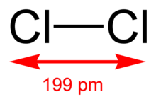 Wie die anderen Halogene liegt auch Chlor als zweiatomiges Molekül vor. Der Abstand zwischen den Chloratomen beträgt 199 pm. Chlor hat mit 242 kJ/mol die höchste Dissoziationsenthalpie aller Halogene.[42] Ein weiterer Hinweis darauf ist die Temperatur, bei der 1 % aller Halogenmoleküle dissoziiert sind und die bei Chlor 975 °C, bei Brom 775 °C und Iod 575 °C beträgt. Auch Fluor hat mit 765 °C eine niedrigere Temperatur.[43] Dass Chlor und nicht wie zu erwarten Fluor das Halogen mit der höchsten Dissoziationsenthalpie ist, liegt an der besonders kurzen Bindung des Fluors, bei der es zu Abstoßungen zwischen den freien Elektronenpaaren und damit zur Schwächung der Bindung kommt. Zwischen den weiter entfernten Chloratomen kommt es dagegen nicht zu einem solchen Effekt und daher trotz größerer Entfernung der Atome zu einer stärkeren Bindung.