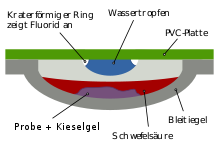 Eine zweite Nachweismöglichkeit ist die sogenannte Wassertropfenprobe. Dabei wird die fluoridhaltige Substanz mit Kieselsäure und Schwefelsäure zusammengebracht. Es entsteht gasförmiges Siliciumtetrafluorid. Über das Gefäß mit der Probe wird ein Wassertropfen gehalten. Durch Reaktion von Siliciumtetrafluorid mit dem Wasser bildet sich Siliciumdioxid, das als charakteristischer weißer Rand um den Tropfen kristallisiert.