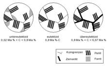 Bei einer übereutektoiden Perlitbildung, also bei einem Kohlenstoffgehalt von 0,8 Ma.% < C < 6,67 Ma.%, entsteht bereits vor der Perlitumwandlung Zementit. Im Gegensatz zu dem bei der Perlitbildung entstehenden Zementit, liegt dieser Zementit nicht in Lamellenform vor, sondern bildet sich vornehmlich an den Korngrenzen und ist somit gefügemäßig zu unterscheiden.