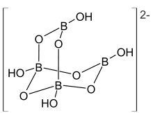 In den Anionen des Borax liegen Tetraborat-Ionen vor, bei denen jedes Boratom mit zwei oder drei (bei zwei Atomen) weiteren Boratomen über eine Sauerstoffbrücke miteinander verbunden ist. Zusätzlich ist jedes Boratom durch eine Hydroxygruppe nach außen abgesättigt, so dass sich eine Formel von [B4O5(OH)4]2− für das Anion ergibt.