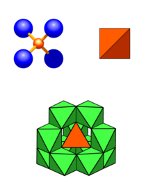 Unten: Umgebung der Tetraederposition: 12 Oktaeder (über Ecken verknüpft)
