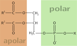 Die Reste R1 und R2 bestimmen die Fettsäuren, der Rest X bestimmt die Klasse. Bei X = H liegt Phosphatidsäure vor
