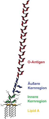 - Ein an den Kern gebundenes Oligo- oder Polysaccharid bildet den dritten, äußeren Bereich. Es bildet eine Kette aus einer oder mehreren Hexosen, zum Beispiel Rhamnose, Galactose, Glucose und Mannose, sowie einem oder mehreren Didesoxyzuckern wie Abequose, Colitose, Paratose oder Tyvelose, zum Teil modifiziert. Diese Zucker sind in vier- oder fünfteilige Sequenzen verbunden, die oft verzweigt sind. Durch die Wiederholung der Zuckersequenzen entsteht das lange Polysaccharid. Dieses Polysaccharid wird als O-Polysaccharid bezeichnet, weil es als O-Antigen des Bakteriums fungiert. Dieser Bereich ist je nach Bakterienart und -stamm verschieden und kann zur Unterscheidung der Bakterien genutzt werden, unter anderem zur Differenzierung pathogener und nicht pathogener Arten. Dazu verwendet man in der Regel serologische Methoden, vor allem die Gruber-Widal-Reaktion. So können etwa Typhus und andere Salmonellosen unterschieden werden.