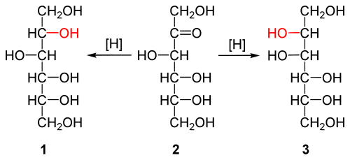 Die Reduktion von Ketosen dagegen generiert ein neues Stereozentrum in beiden möglichen Konfigurationen, so dass aus einer Ketose ein Gemisch zweier unterschiedlicher (epimerer) Alditole gebildet wird: