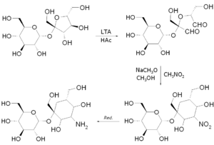 Es gibt verschiedene Wege, Aminozucker herzustellen. Eine Methode ist eine Ringschlussreaktion vom Aldoltyp zwischen Dialdehyden und Nitroalkanen. So kann etwa Saccharose zuerst mit Blei(IV)-acetat und Essigsäure am Ring der Fructofuranose-Untereinheit oxidativ gespalten, jener anschließend wieder über Reaktion mit Nitromethan unter Präsenz von Natriummethanolat und Methanol geschlossen und anschließend die Nitrogruppe zur Aminogruppe reduziert werden.