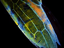 Chitin wird seit mindestens 500 Millionen Jahren von Lebewesen produziert.[15][16] Entgegen der landläufigen Meinung ist Chitin nicht dafür verantwortlich, dass ein (Insekten-)Panzer hart ist.[17] Chitin ist für dessen Weichheit und Biegsamkeit verantwortlich. Erst im Zusammenspiel mit dem Strukturprotein Sklerotin wird die Cuticula der Insekten hart und stabil. Bei Crustaceen wird zur Erhöhung der Härte zusätzlich Kalk eingelagert.