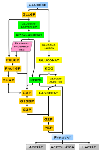 Von 1850 bis 1857 führte Claude Bernard Studien über Glykogen und Zuckerbildung in der Leber durch.[24] Für die Aufklärung des Stoffwechsels der Glucose erhielt Otto Meyerhof 1922 den Nobelpreis für Physiologie oder Medizin.[25] Hans von Euler-Chelpin erhielt zusammen mit Arthur Harden im Jahr 1929 den Nobelpreis für Chemie für ihre Forschung über die „Zuckervergärung und deren Anteil der Enzyme an diesem Vorgang“.[26][27] Im Jahr 1947 erhielten Carl und Gerty Cori für ihre Entdeckung der Wiederverwertung der im Muskel durch Glycolyse produzierten Milchsäure für die Gluconeogenese und Glycogensynthese in der Leber sowie Bernardo Houssay für seine Entdeckung der Rolle der Hypophysenhormone im Glucosestoffwechsel den Nobelpreis für Physiologie oder Medizin.[28][29][30] Für die Entdeckung der aus Glucose gebildeten Zucker-Nukleotide bei der Biosynthese von Kohlenhydraten erhielt Luis Leloir im Jahr 1970 den Nobelpreis für Chemie.[31]