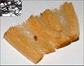 Geöffneter gebrauchter Zigarettenfilter – die Fasern aus Celluloseacetat sind braun gefärbt. -