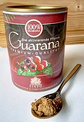 Coffein ist der Hauptwirkstoff des Kaffees. Außer in den Samen des Kaffeestrauchs kommt es auch in über 60 anderen Pflanzen vor, wie zum Beispiel dem Teestrauch, Guaraná, Guayusa, dem Mate-Strauch und der Kolanuss. Die chemisch mit Coffein eng verwandten Wirkstoffe Theophyllin und Theobromin[15] finden sich ebenso in zahlreichen Pflanzenspezies. Ungeröstete Kaffeebohnen enthalten je nach Sorte etwa 0,9–2,6 % Coffein; nach der Röstung verbleiben 1,3–2,0 %. Dabei enthalten die Coffea-arabica-Sorten weniger Alkaloid als die Coffea-robusta-Typen.[13] Fermentierte und getrocknete Teeblätter, sogenannter Schwarzer Tee, enthalten – ebenso wie unfermentierter Grüner Tee[16] – etwa 3–3,5 % Coffein.[17]