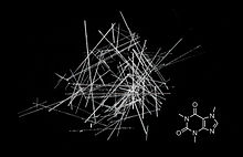 Coffein bildet bei Kristallisation aus Wasser ein kristallines Hydrat in Form langer Nadeln. Stöchiometrisch enthält das Hydrat im Kristallgitter 0,8 mol Wasser pro Mol Coffein.[21]