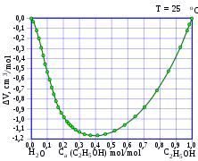 Ethanol ist in jedem Verhältnis mit Wasser mischbar. Dabei kommt es beim Vermischen unter Wärmeentwicklung zu einer Volumenkontraktion. Das Gesamtvolumen einer Wasser/Ethanol-Mischung ist kleiner als die Summe der Einzelvolumina. So entstehen durch Mischen von 50 ml Ethanol mit 50 ml Wasser 97 ml Ethanol-Wasser-Gemisch.