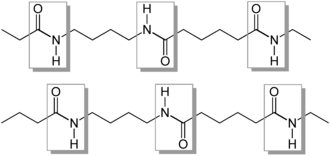 (enthält eine Kette aus 6 Kohlenstoffatomen) und Adipinsäure (enthält eine Kette aus 6 Kohlenstoffatomen), also [NH–(CH2)6–NH–CO–(CH2)4–CO]n.
