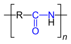 ![]() Wiederholeinheiten von Polyamiden, die aus Lactamen oder Aminocarbonsäuren hergestellt werden. Die Carbonsäureamid-Gruppe ist blau gekennzeichnet. R steht für den Rest der zur Synthese eingesetzten Verbindung. |