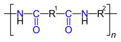 ![]() Wiederholeinheiten von Polyamiden, die aus einem Diamin und einer Dicarbonsäure hergestellt werden. R1 steht für den Rest der eingesetzten Dicarbonsäure, R2 für den Rest der eingesetzten Diaminverbindung. |