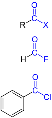 Die dort dargestellten Synthesereaktionen funktionieren auch für die entsprechenden Fluor- und Bromanaloga. Carbonsäurefluoride erhält man außerdem aus Carbonsäurechloriden und Kaliumhydrogendifluorid unter Abspaltung von Kaliumchlorid und Chlorwasserstoff: