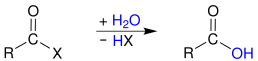 Mit Wasser reagieren Carbonsäurehalogenide unter stürmischer, stark exothermer Reaktion zur jeweiligen Carbonsäure und dem entsprechenden Halogenwasserstoff: