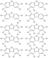 „Dioxine“ kommen meist als Gemisch verschiedener halogenierter Dibenzodioxine und Dibenzofurane vor. Dieses Gemisch kann ein bestimmtes Häufigkeitsmuster (Kongenerenmuster) aufweisen, aus dem sich Rückschlüsse auf die Entstehungsursachen ziehen lassen.