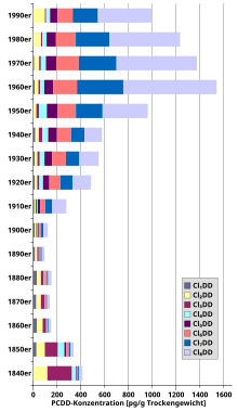 Da Dioxine sehr lipophil (fettlöslich) sind, reichern sie sich bei Menschen und Tieren insbesondere im Fettgewebe an. Als Indikator für die Dioxin-Belastung von Menschen wird häufig Muttermilch untersucht,[38] da sich aufgrund des hohen Fettgehaltes Dioxine darin anreichern und Proben leicht zu bekommen sind. Der Nachweis von Dioxinen in Muttermilch gelang schwedischen Wissenschaftlern erstmals 1984, die Kieler Bundesanstalt für Milchforschung stellte 1985 fest, dass in Muttermilch die Dioxin-Richtwerte für Kuhmilch häufig überschritten wurden. Es wurde empfohlen, Säuglinge nicht länger als ein halbes Jahr zu stillen.[39] Bedingt durch gesetzliche Regelungen und daraus resultierende technische Maßnahmen ist in Mitteleuropa die Gesamtbelastung durch Dioxine deutlich zurückgegangen.