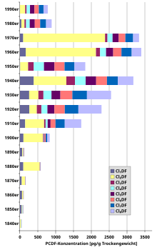 In Gewässer gelangen Dioxine und Furane vor allem durch Deposition aus der Atmosphäre und mit dem Abwasser. Als lipophile Verbindungen lagern sie sich zu einem großen Teil an im Wasser gelöste Kolloide wie Huminstoffe, an im Wasser schwebende (suspendierte) organische Partikel oder die lipophile Kahmhaut auf dem Wasser an. Frei im Wasser gelöste PCDD/PCDF können sich in die Atmosphäre verflüchtigen, unmittelbar an der Wasseroberfläche findet ein Abbau durch Photolyse statt. An Partikel gebundene Dioxine und Furane werden zum größten Teil in den Sedimenten abgelagert. Anhand von zeitlichen Trends der Konzentrationen in datierten Sedimentkernen können Rückschlüsse auf historische Emissionen gemacht werden. Allerdings muss beachtet werden, dass sich die Kongenerenmuster durch verschiedene Abbauprozesse (z. B. reduktive Dehalogenierung) verändern können. Der Anteil von niedrig chlorierten PCDD/PCDF kann daher über längere Zeiträume zunehmen. Trotzdem kann aufgrund der vor dem Jahr 1900 dominierenden niedrig chlorierten PCDD geschlossen werden, dass in dieser Zeit der Eintrag durch die Dimerisierung von 2,4-Dichlorphenol groß war. Seit etwa den 1960er-Jahren sind die Einträge von PCDD und PCDF in das Esthwaite Water in Nordengland rückläufig (siehe Grafiken rechts).[30] Dies ist vor allem auf technische Maßnahmen in der Industrie und bei der Müllverbrennung zurückzuführen.