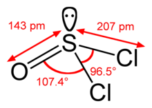 Thionylchlorid ist eine farblose bis gelbliche, an der Luft rauchende Flüssigkeit, die sich in Wasser oder bei Erhitzung oder unter Lichteinwirkung zersetzt. Ihre Dämpfe wirken schon bei großer Verdünnung erstickend. Die Verbindung reagiert heftig mit Wasser und Basen sowie mit einigen Alkoholen. Beim Erhitzen über 80 °C zerfällt es in Schwefeldioxid, Chlor und Dischwefeldichlorid, gemäß der Gleichung: