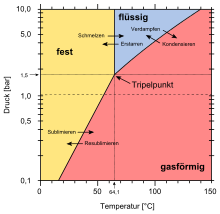 Der Tripelpunkt, an dem die drei Phasen fest, flüssig und gasförmig im Gleichgewicht stehen, liegt bei einer Temperatur von 64,05 °C und einem Druck von 1142 Torr (das sind ca. 1,5 bar oder 1500 hPa). Erst oberhalb dieses Drucks ist auch eine flüssige Phase möglich.