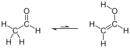 Tautomeres Gleichgewicht zwischen Ethanal (Acetaldehyd, links) und Ethenol (Vinylalkohol, rechts)
