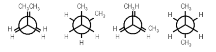 - Beträgt der Torsionswinkel 120 oder 240 Grad, so ist die Konformation partiell-ekliptisch. Sie ist aus den gleichen Gründen wie beim Ethan energetisch ungünstig. Anders als in der voll-ekliptischen Konformation kommen sich die beiden Methylgruppen jedoch nicht zu nahe, so dass die Energie nur lokal ein Maximum darstellt.