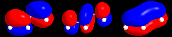 Dieses liegt daran, dass aufgrund der sp²-Hybridisierung des Kohlenstoff-Atoms, das an der Einfach- und an der Doppelbindung beteiligt ist (im Fall von 1,3-Butadien in der rechten Abbildung die C-Atome 2 und 3), die bindenden Molekülorbitale keine solche räumliche Ausdehnung haben wie bei einer sp³-Hybridisierung beispielsweise bei den Alkanen.