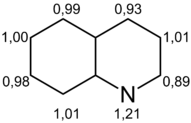 Neben Chinolin sind auch die Bezeichnungen Benzopyridin und 1-Azanaphthalin gelegentlich anzutreffen.[4] Benzopyridin beschreibt das Molekül als Pyridin mit anelliertem Benzolring und ist ohne weitere Qualifikatoren nicht eindeutig, da diese Bezeichnung auch auf das isomere Isochinolin zutrifft; korrekt und eindeutig ist Benzo[b]pyridin. 1-Azanaphthalin beschreibt Chinolin als Derivat von Naphthalin, bei welchem das Kohlenstoffatom (oder besser die Methingruppe) in 1-Position durch ein Stickstoffatom ausgetauscht wurde. Im Gegensatz zu Benzopyridin ist diese Bezeichnung eindeutig.
