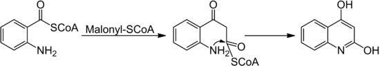 Einige Chinolinalkaloide treten als Naturstoffe in biologischen Systemen auf. Der exakte biosynthetische Aufbau des Chinolins ist abhängig vom biologischen System und der genauen Struktur des Chinolinderivats. Den biochemischen Zugang einiger Chinolinderivate stellt die Aminosäure Tryptophan dar, aus welcher in einer mehrstufigen Reaktion das Chinolingerüst aufgebaut werden kann. Über einen weiteren Syntheseweg ausgehend von Anthranilsäure sind hydroxylierte Chinolingerüste zugänglich. Die Fortführung der Synthese führt zu Acridinderivaten.[42]