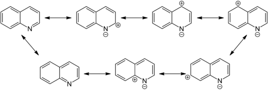 Chinolin ist über sieben mesomere Grenzstrukturen resonanzstabilisiert. Analog dem Naphthalin existieren zwei Grenzstrukturen, welche keinen zwitterionischen Charakter besitzen. Zusätzlich können jedoch fünf weitere zwitterionische Grenzstrukturen formuliert werden, welche dem Stickstoffatom eine negative Ladung zuweisen, wodurch die positive Ladung über das aromatische System verteilt wird. Die Lage der Ladung am Stickstoffatom steht im Einklang mit dessen höherer Elektronegativität im Vergleich zu Kohlenstoff.
