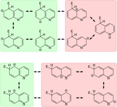 Im Vergleich zu Pyridin reagiert Chinolin leichter im Sinne einer elektrophilen aromatischen Substitution. Dieser Umstand ist der höheren mittleren Elektronendichte im aromatischen System geschuldet, die durch den relativ elektronenreicheren Benzolring der Verbindung hervorgerufen wird. Auf Grund der höheren Elektronendichte im Benzolring, finden elektrophile Substitutionen bevorzugt an diesem statt. Häufig sind im Reaktionsgemisch für elektrophile Substitutionen auch Brønsted- oder Lewis-Säuren anwesend. Diese können an das Stickstoffatom des Pyridinrings addieren und verursachen damit eine noch stärkere Desaktivierung des Pyridinrings.[5][29] Aus den beschriebenen elektronischen Gründen laufen elektrophile Substitutionen am schnellsten an den 5- und 8-Positionen des Chinolins ab. So wird als Nitrierungsprodukt eine Mischung aus gleichen Teilen von 5- und 8-Nitrochinolin erhalten, während weitere Isomere nur in untergeordnetem Maße gebildet werden.[52] Die Nitrierung von Chinolin weist hierbei eine schwächere Selektivität auf als jene des Isochinolins, bei der praktisch ausschließlich 5-Nitroisochinolin gebildet wird.[5]
