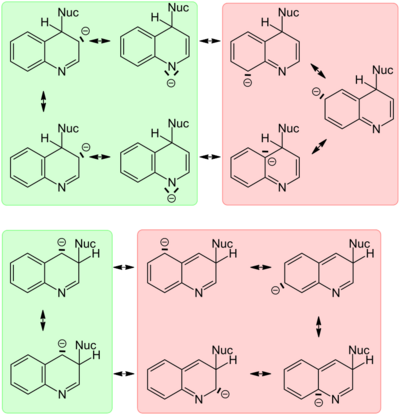 Chinolin kann durch Verwendung der zu Grunde liegenden Lithiumorganyle oftmals direkt alkyliert oder aryliert werden. Das nach wässriger Aufarbeitung der Reaktion als Zwischenprodukt entstehende Dihydrochinolinderivat kann thermisch rearomatisiert werden.[58] Sind gute Abgangsgruppen vorhanden, so ist analog dem Pyridin eine Reihe von ipso-Substitutionen an Chinolin bekannt. Substitutionen an der 3-Position weisen hierbei eher Charakteristika von ipso-Substitutionen an den entsprechenden Halogenaromaten auf, während solche an den 2- und 4-Positionen denen an Pyridin ähneln.[5]