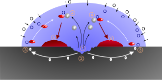 Ist jedoch Sauerstoff vorhanden, übernimmt er den Transport der Elektronen. Er diffundiert von außen in den Wassertropfen (siehe Schemazeichnung). Der Konzentrationsunterschied im Wassertropfen erzeugt nun eine Potenzialdifferenz zwischen (2) und (3). Der anodische Bereich (2) und der kathodische Bereich (3) bilden mit dem Wasser als Elektrolyten eine galvanische Zelle, eine Redoxreaktion läuft ab.