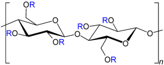| Cellulose und Cellulosederivate (R= Methyl, Ethyl, Acetyl, Propionyl, Hydroxymethyl, Carboxymethyl etc.) mit von oben nach unten ansteigendem molaren Substitutionsgrad (schematische Präsentation) |