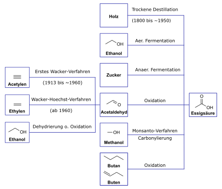 Die erste großtechnische Herstellung erfolgte im Ersten Wacker-Verfahren durch die Hydratisierung von Acetylen unter Quecksilbersulfat/Schwefelsäure-Katalyse zu Acetaldehyd. Dieser wurde unter Mangankatalyse weiter zu Essigsäure oxidiert. Die Wacker Chemie entwickelte dieses Verfahren 1913.