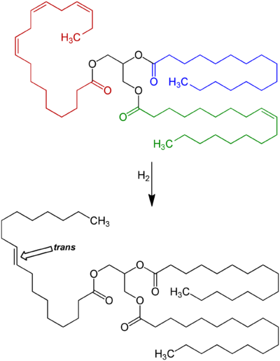 Beim längeren Erhitzen von Pflanzenölen – z. B. beim Frittieren – mit hohem Gehalt an mehrfach ungesättigten cis-Fettsäureestern (abgeleitet von der Linol- oder Linolensäure) findet eine Isomerisierung von cis- zu trans-Fettsäureestern statt.[8]