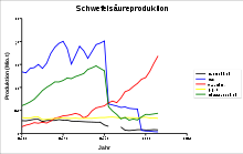 In den letzten Jahrzehnten ist die Schwefelsäureproduktion vor allem in China stark gestiegen, während in europäischen Ländern wie Deutschland die Produktion zurückgegangen ist. Seit Anfang 2000 ist China auf zusätzliche Mengen aus Europa angewiesen. Die in der Graphik zu sehenden starken Umbrüche in den Jahren 1990 und 1991 sind auf die Auflösung der Sowjetunion und eine Änderung der Statistik in den Vereinigten Staaten zurückzuführen.