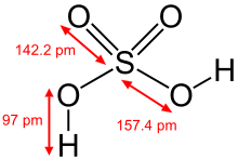 Die Bindungen im Schwefelsäuremolekül können durch verschiedene mesomere Grenzstrukturen beschrieben werden. Zum Beispiel die Struktur, bei der zwischen Schwefel und Sauerstoff Doppelbindungen angenommen werden oder bei der nur Einfachbindungen und gleichzeitig eine Ladungstrennung vorliegen. In theoretischen Berechnungen hat sich gezeigt, dass die 3d-Orbitale nur sehr wenig zur Bindung beitragen. Daher wird die reale Bindungssituation im Schwefelsäuremolekül am genauesten durch diejenige Struktur beschrieben, bei der nur Einfachbindungen gezeichnet werden. Die verkürzte S–O-Bindung kann durch zusätzliche elektrostatische Wechselwirkungen zwischen den geladenen Atomen erklärt werden.