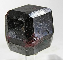- zwei einander gegenüberliegende Kanten, die an keine besetzte Gitterposition angrenzen mit Längen zwischen 0,274 nm (Almandin, Andradit) und 0,276 nm (Goldmanit)