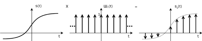 Die Multiplikation eines glatten, schnellfallenden kontinuierlichen Signals mit einem Dirac-Kamm ist das Modell eines idealen Abtasters (engl.: sampler) mit der Abtastrate T.