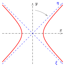 Ein Beispiel einer algebraischen Kurve mit zwei schiefen Asymptoten ist eine Hyperbel, die durch die Gleichung