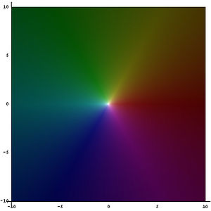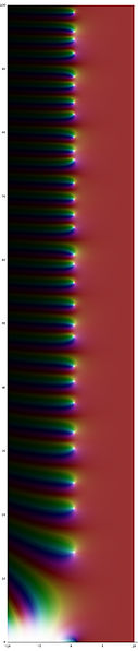 Die Nullstellen der Riemannschen Zetafunktion . Bereich: x = -10.10, y = 0..100. Farbton ist komplexe Phase (Rot ist 0), Helligkeit ist absoluter Wert (heller ist weniger, dunkler ist mehr).