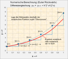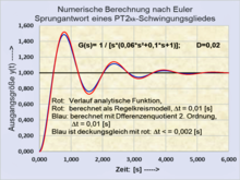 - Andere Methoden der numerischen Berechnung bedienen sich zur besseren Approximation z.B. an Stelle des Euler-Streckenzugverfahrens des Trapezflächenverfahrens (Heun-Verfahren), des Mehrschrittverfahrens (Adams-Bashforth-Verfahren) und anderer Verfahren. Grund der aufwendigeren Approximationsverfahren und damit der umfangreicheren Differenzengleichungen ist die erzielbare höhere Genauigkeit und damit Reduzierung der Rekursionsfolgen, was bei langsamen Mikrocomputern und dessen Schnittstellen bei Echtzeitberechnungen erforderlich sein kann.