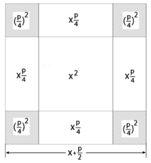 Zur Lösung der quadratischen Gleichungen verwendete al-Chwarizmi keine Äquivalenzumformungen, also keine algebraische Argumentation, sondern in Anlehnung an die griechische Tradition geometrische Argumente. Als Beispiel soll die Gleichung, wie sie bei al-Chwarizmi auftritt,