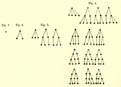Für die Anzahl der Bäume mit m Blättern leitet er eine Formel her, die