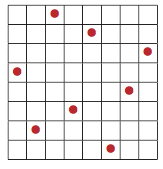 Permutationsmatrix der Permutation (3,5,8,1,7,4,2,6). Die roten Punkte zeigen die Einseinträge an.