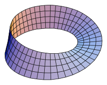 Wenn man dagegen die Punkte A und C sowie D und B zusammenklebt, was nach „Verdrillung“ der Schmalseiten möglich ist, und wenn das „Zusammenkleben“ nahtlos erfolgt, entsteht eine nicht orientierbare zweidimensionale Mannigfaltigkeit mit Rand. Diese wird Möbiusband genannt.