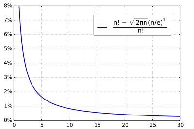 {\displaystyle n!\simeq n^{n}\cdot {\sqrt {2\pi n}}\cdot \mathrm {e} ^{-n+{\frac {1}{12n}}-{\frac {1}{360n^{3}}}+\cdots +{\frac {B_{2k}}{(2k-1)2k}}\cdot {\frac {1}{n^{2k-1}}}+\cdots },\quad n\to \infty }