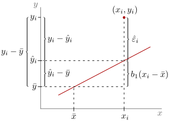 Das Bestimmtheitsmaß der Regression, auch empirisches Bestimmtheitsmaß,[A 3] ist eine dimensionslose Maßzahl die den Anteil der Variabilität in den Messwerten der abhängigen Variablen ausdrückt, der durch lineare Modell „erklärt“ wird. Gegeben die Quadratsummenzerlegung ist das Bestimmtheitsmaß der Regression definiert als das Verhältnis der durch die Regression erklärten Quadratsumme zur totalen Quadratsumme:[A 4]